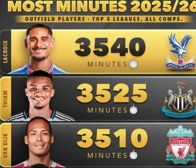吉祥体育 – 2025-26赛季欧洲五大联赛非守门员球员最新出场时间列表